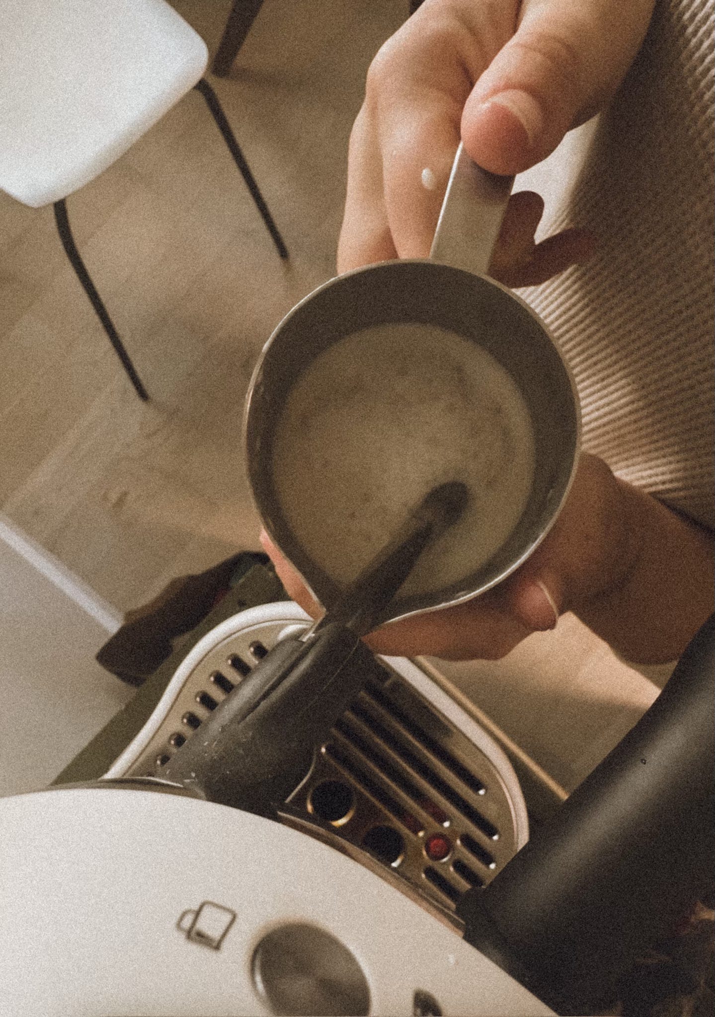 Tilt your cup slightly toward the pitcher. This helps the milk integrate with the crema instead of sitting on top.